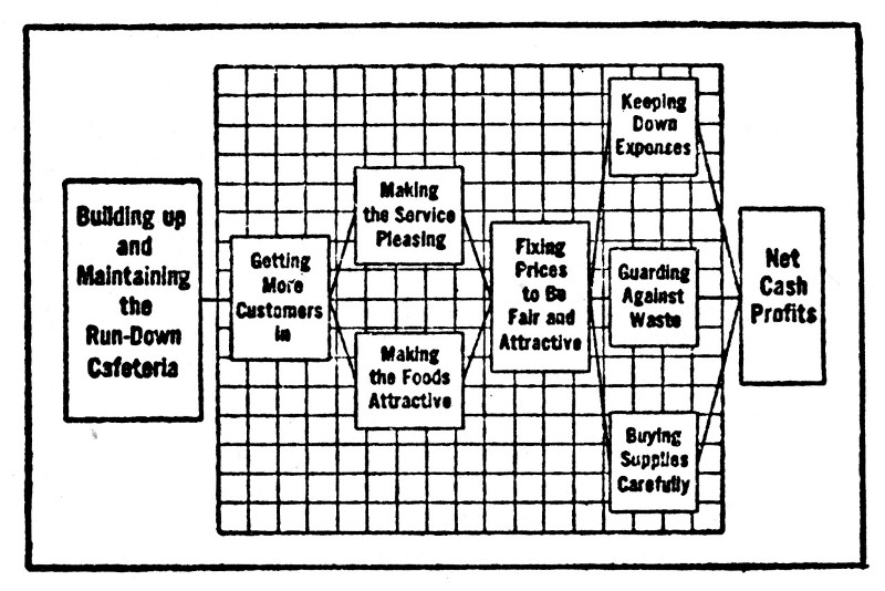 Consider for the moment that you have a house built of blocks and want to take it to pieces. A quick and easy way of separating it into its component parts would be a swift kick aimed down around the foundations. A quick method. But comes nothing.[21] There are all your blocks lying on the floor, but so far as knowing what they're all about, you're worse off than ever you were before you kicked your house down. The other way of taking your house of blocks to pieces is to start with the roof and WORK BACKWARDS. The very thought, then, of "taking to pieces" suggests the correct way to undertake the analysis of a business or of a job. And a study of the methods of successful managers will convince the doubtingest Thomas that starting at the top and working down to the cellar is the method they follow in the analysis of any business problem they have to tackle. Once a busy ceramic manufacturer found himself in the restaurant business. He knew about all there was to know about dinnerware up to the point where it left his customers' counters. What went on after that was pretty much Greek to him if you know what we mean. And then he became a restaurateur. All[22] because his brother-in-law got into him for several thousand dollars and then couldn't quite seem to make the darned thing pay a profit. Brother-in-law knew the game. Oh, yes. He had worked for a number of years as assistant manager in a similar enterprise. With his "knowledge of the business," he should have made a success of this cafeteria of his. He knew how to handle the help, how to buy, how to run the kitchen, and so on. The operating details were as an open book to him. Judged from every outward appearance, the cafeteria was up to standard. It should have climbed out of the red in short order. He had been taught to buy carefully and to manage economically. "Well bought," he announced, "is half sold." He'd read it in a book and he thought he was being a good salesman. Still the business stayed in the red. Our ceramic friend was faced with kiss[23]ing his investment goodbye—and probably with making a job in the pottery for a good restaurant man—with throwing good money after bad, or with getting into the cafeteria business. He figured this business ought to pay. Somewhere, he knew, his brother-in-law had gone wrong. Just where, he believed he could find out. So he took over the business. Brother-in-law stayed on, leaving the new owner free to observe. And he did nothing but observe for a solid week. Each night he made a list of the points in managing which had come up in the course of the day's work. In a week's time he had an accurate list of all the actual jobs of managing, as all bills except for gas and light and rent were paid and a profit and loss statement was taken each week. Then he arranged the list in order of natural importance.[24] It began with marketing and checking bills with deliveries, and ended with counting the money and depositing it in the bank. "Hold on," he thought, "this isn't such a long way from running a pottery. What am I in this business for?" "Because," he answered, "I want to leave as much of that money in the bank as possible, and mark it down as profit."