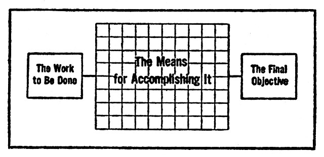So much for our "beneficent circle." Let us look into this thing called PLANNING and find out if there isn't some way of developing a knack of planning which will help us over the second major hurdle in our road to managing. There is, we shall find, a single problem with which the planner, the constructive manager, deals. Again, it doesn't make a particle of difference whether it's Mr. Schwab and Bethlehem Steel or Tonio and his peanut stand. No business is so "different" that the principles of management fail to apply.[54] All right, then. The problem of every planner is first to determine what is the PRIMARY MOVING FORCE—the "initiative"—behind his job, and then to find the EASIEST PLACE TO APPLY THAT FORCE in order to set up the required MOTION or ACTIVITY with the LEAST AMOUNT OF EFFORT THAT WILL GET THE BEST RESULTS. A long sentence. Go over it again and you will find it is divided into four distinct parts: 1. Deciding on the PRIMARY MOVING FORCE with which to set the wheels in motion. 2. Applying this FORCE at the PROPER PLACE TO GET EASIEST ACTION. 3. Directing this action along lines which either offer LEAST RESISTANCE or assure GREATEST ACCOMPLISHMENT. 4. Bringing the activities to a focus at[55] the place or time that will best carry the work to a SUCCESSFUL CONCLUSION. The PRIMARY MOVING FORCE may be the selection of media in an advertising plan; it may be the pushing of a button in the White House which opens a dam in Arizona, a Century of Progress in Chicago, or the Annual Convention of Whammit Manufacturers at Atlantic City; or it may be the memo from the big boss which gives the research department carte blanche on a development project. To apply this initiative to a place where it will get QUICK ACTION may be to suggest an idea in the headline of an advertisement that will set the reader to thinking of salmon fishing at Mooselookmeguntic, or of the time the ice cubes gave out just when they shouldn't. Or it may be to classify the output of a factory before shipping so that freight cars can be packed to best advantage or so that lowest freight rates may be secured. Or it may be a simple[56] method of sorting mail so that subordinates get the jobs they can handle and only the important business is brought to the president's attention. Directing this ACTIVITY along the lines that ASSURE GREATEST ACCOMPLISHMENT may be—in the advertisement—the presentation of facts or advantages which will persuade the reader that the fishing tackle you manufacture is desirable. Again, it may be the dovetailing of a thousand elements in a huge project like the Russian Five-Year Plan so that an adequate supply of ore will be available when the blast furnaces roar into operation; so that the steel will be on hand when production in the Cheliabinsk tractor works is stepped up to meet the requirements of the new agricultural regime. Or it may involve the simple sweeping of a floor in a manner which raises a minimum of dust. And bringing the activities to a SUCCESSFUL CONCLUSION may mean working up the arguments of the advertise[57]ment to the psychological closing of a sale—to the point where the ardent member of the Isaak Walton League figures he can live no longer without your fishing tackle and sets out gaily in the general direction of Abercrombie and Fitch's. Or it may be coordinating the entire production of a factory so that the Diesel generator set ordered by the Santa Fé can be delivered at the exact date specified in the original order. Or it may be handling the day's correspondence on the credit man's desk so that letters which must "make the Century" are ready to go at 11:45—so that the rest of the day's work is ready to sign, stamp and mail before the 5 o'clock whistle blows. FOUR ELEMENTS, then, in any job which is to be PLANNED. Every plan, if practicable, will follow them. There is, by way of further illustration, the story of the factory manager of a food manufacturing plant who laid out a PLAN for an operation no more intricate than the[58] scrubbing of the floors at night. Now it can be told. And for two good reasons. First, because it was a practical plan which, even on such a lowly operation, saved quite a bit of money. Second, because in its construction the plan is, from the point of view of our four elements, what has sometimes been called a "natural." One night, it seems, the manager and his wife went to the movies. The town didn't have daylight time, so it was quite dark. They passed the plant, a large six-story building. "Why, Ed!" exclaimed the wife, "you didn't tell me the factory was working nights." Ed, like most husbands, was in the habit of telling friend wife 'most everything. For once he was at a loss. Sure enough, the lights were going full tilt on all floors. Hitting on all six, you might say. Then he laughed. It all came to him—"It's just the scrubwomen at work."[59] One feature picture, one newsreel and one animated cartoon later, they walked past the plant again. "Look, the factory's still lit up," remarked the wife who turned off the living room lights religiously when she went out to get supper ready. This time Ed didn't laugh. In days like these one doesn't. Not, at any rate, at the thought of mounting electricity bills. The very next evening he was on the job. Time somebody found out what was what. In came the cleaners. They switched on the office lights—all of them—and two of the crew went to work. A couple of others went up to the second floor, switched on all the lights and pitched in with a vim. And so ad infinitum—or at least to the sixth story. And all the while the electric meter went round and round! Twenty-four hours later the janitor had a new plan of work.[60] First the manager thought he'd start the whole crew at the top and work down. On second thought, a better plan was born—like the goddess of wisdom who sprang full grown from her papa's forehead. If I must go at this cleaning job, he thought, I might just as well ma