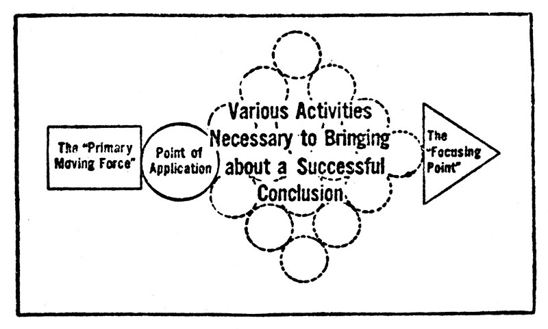 Turn back now to the FOUR ELEMENTS OF SUCCESSFUL PLANNING as we set them down on page 54. Try them out on any successful plan and assure yourself that not a point has been stretched. By using them we shall learn the constructive, creative KNACK OF PLANNING. Stripped of the "clothes" which every plan wears—it's only in the clothing that plans differ—this KNACK OF PLANNING may be quite simply visualized by some such chart as the one shown on the opposite page. There you see the PRIMARY FORCE—the INITIATIVE that sets the PLAN in action. Second, the POINT OF APPLICATION—where you must hit if you're going to win. Third, the various activities which bring about the SUCCESSFUL CONCLUSION. And fourth, all these[65] activities headed up at the FOCUSING POINT.