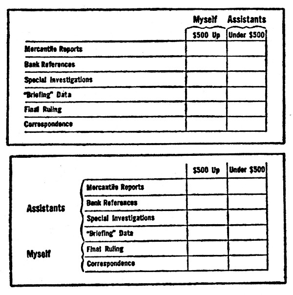 Where is this DIVIDING LINE? How shall we know where to DEPUTIZE and when to PERFORM? What kind of work shall we turn over to subor[103]dinates? What shall we reserve for ourselves? Again, whatever the job or business we are engaged in organizing, there are simple rules to follow. But first an illustration which will help to make the point. Consider the credit man for a large concern which sold machines on a monthly payment plan. He was always in a jam with the sales department. It took too long, complained the sales manager, to get credit rulings. It was no fun to put a whole lot of work into selling the customer, only to have the order turned down by the house because of poor credit. Why couldn't the credit man give them a ruling before they attempted to close a sale? Sometimes it took so long to get an O.K. that the prospect got all cold and went somewhere else. The treasurer of the company was drawn into the picture when the sales manager openly declared he'd "get" the credit man.[104] And it certainly looked as if the sales manager had a good case. "But," protested the credit man, "I've made mighty few mistakes. As for delays—well, I don't know how I could work any harder." "Maybe you work too hard," the treasurer ventured. "Hm, if I didn't do what I do, I don't know who would." "Hold on, now, let's get this thing straight. You're valuable to the company because of your long experience and good judgment on credits. When you have all the dope on a man, I'll bet my last dollar on your decision. The only mistakes you ever make are when you hurry your decisions. "But—and here's the point—you aren't any better at digging out the facts than either of your two assistants. Yet here's what you do. You divide salesmen's requests for credit rulings into two groups. You take those that run over $500; your[105] assistants get the others. Each of you does his own investigating and digging—and except in puzzling cases, you practically let your two men make their own decisions.